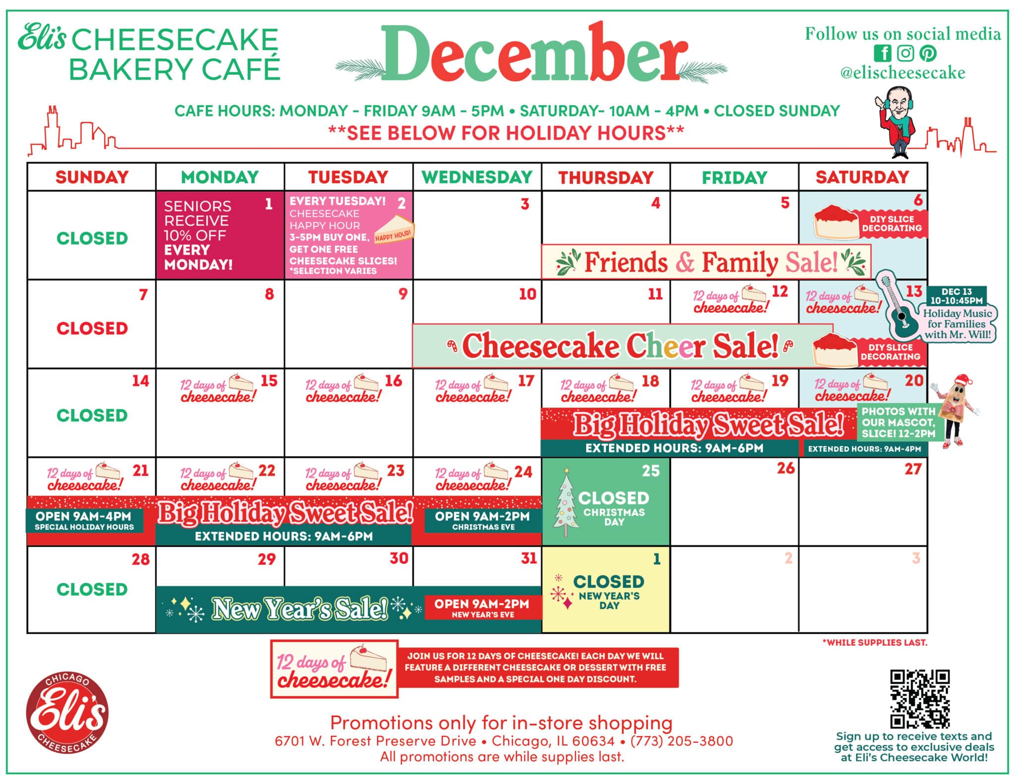 Enjoy new desserts and old favorites, plus the largest selection of Eli’s Cheesecake anywhere. Our cafe offers a complete coffee bar, free WiFi, and lots of free parking for your convenience. Regular Hours: Mon-Fri 9am-5pm, Sat 10am-4pm, Closed Sundays and major holidays.